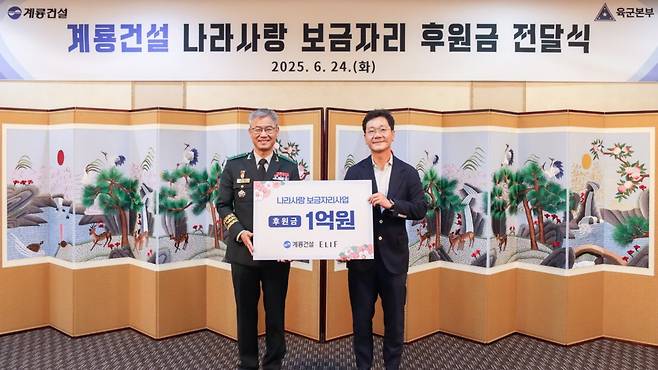 계룡건설은 24일 충남 계룡시 계룡대 무궁화회관에서 열린 '나라사랑 보금자리 사업' 후원금 전달식에서 신은봉 육군인사사령관에게 후원금 1억원을 전달했다.