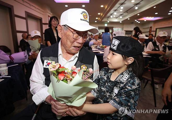 (칠곡=연합뉴스) 김현태 기자 = 25일 경북 칠곡군의 한 웨딩홀에서 열린 참전용사 위안 행사에서 어린이가 참전용사에게 꽃다발을 주고 있다. 2025.6.25