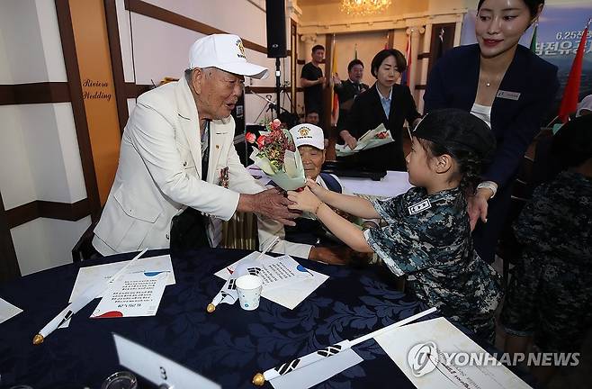 (칠곡=연합뉴스) 김현태 기자 = 25일 경북 칠곡군의 한 웨딩홀에서 열린 참전용사 위안 행사에서 어린이가 참전용사에게 꽃다발을 주고 있다. 2025.6.25
