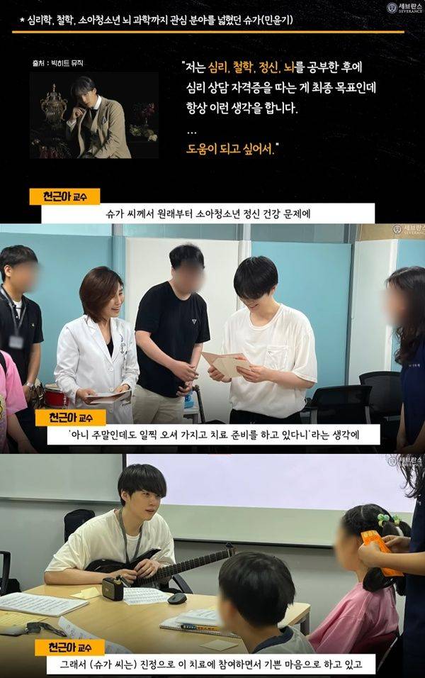 그러면서 "슈가의 좋은 취지와 음악 재능 기부 의사를 어떻게 구현할 수 있을까 걱정이 많이 됐다. 하지만 슈가의 진정성에 이끌렸다"며 "준비 과정부터 프로그램 진행 과정까지 지켜본 바로는 슈가는 단순한 기부자가 아니구나다. 프로그램 참여 내내 한 번도 지각 안 하고, 일찍 와서 기타 연습을 하고 있다. 치료자와 미리 사전 준비 미팅을 하고 있는 것을 보고 제가 숙연해졌던 기억이 난다"고 말했다.