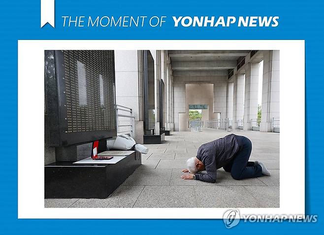 (서울=연합뉴스) 신현우 기자 = 6·25전쟁 75주년인 25일 서울 용산구 전쟁기념관을 찾은 어르신이 6·25전쟁 참전용사인 막내 삼촌 명비 앞에서 절하고 있다. 2025.6.25 [THE MOMENT OF YONHAPNEWS]