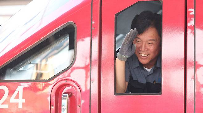 ▲ 김영훈 고용노동부 장관 후보자가 23일 경북 김천역에서 ITX-마음 열차를 운행하기 위해 열차에 탑승해 배웅 나온 역무원에게 인사하고 있다.