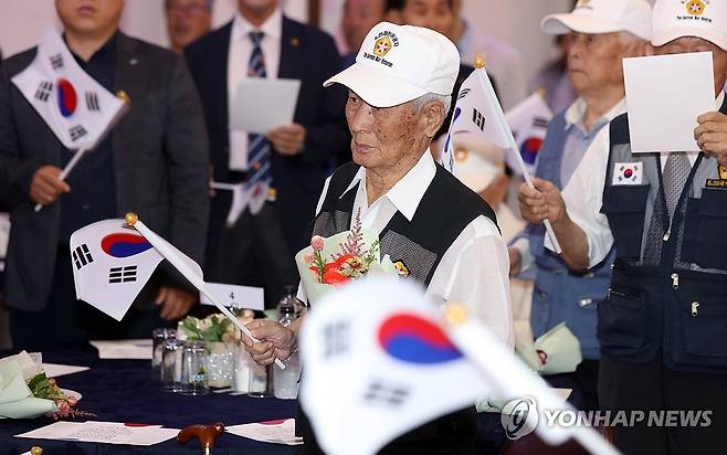 (칠곡=연합뉴스) 김현태 기자 = 25일 경북 칠곡군의 한 웨딩홀에서 열린 참전용사 위안 행사에서 참전용사들이 태극기를 흔들며 6.25 노래를 부르고 있다. 2025.6.25