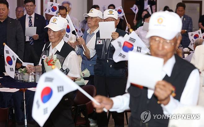 (칠곡=연합뉴스) 김현태 기자 = 25일 경북 칠곡군의 한 웨딩홀에서 열린 참전용사 위안 행사에서 참전용사들이 태극기를 흔들며 6.25 노래를 부르고 있다. 2025.6.25