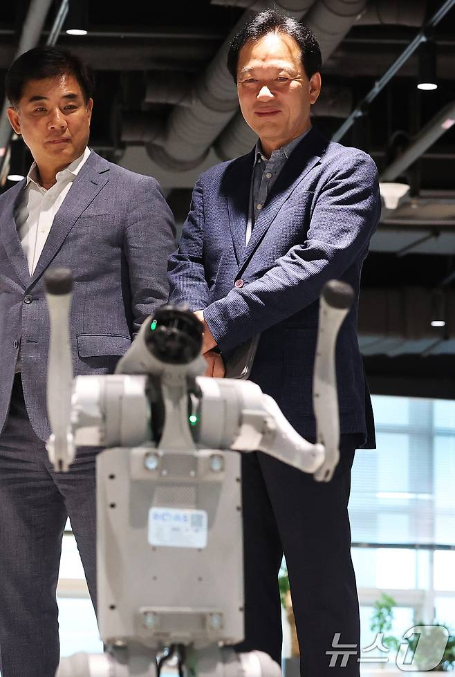 (성남=뉴스1) 김영운 기자 = 정태호 국정기획위원회 경제1분과장과 위원들이 25일 경기도 성남시 수정구 피지컬 AI 로봇 스타트업 마음AI를 방문해 관계자로부터 다양한 피지컬 로봇 설명을 듣고 있다. (공동취재) 2025.6.25/뉴스1