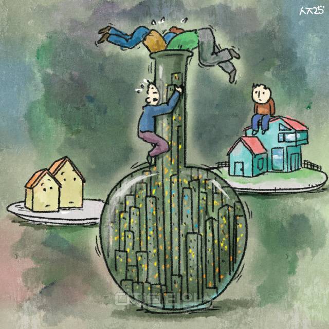 우리 도시의 모습이 바로 이와 같지 않을까? 땅은 좁고 건물은 길다랗다. 인구소멸 위기에 빠진 소도시, 심지어는 농촌에도 고층 아파트가 들어선다. 땅을 딛고 서 있는 집이 아니라 공중에 매달린 듯하다. 마치 여우에게 호리병 속 음식을 건네는 것처럼, 인간의 본성과 맞지 않는 주거 환경에 길들여지고 있다.