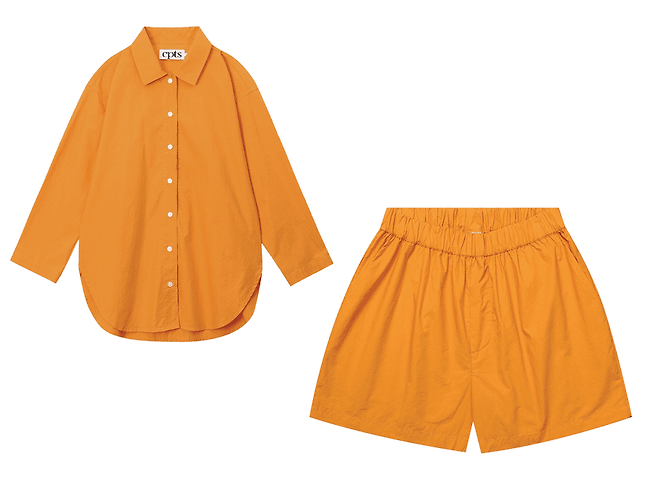 무릎 위까지 오는 기장의 긴소매 셔츠와 쇼트 팬츠의 파자마 셋업. 쨍한 컬러로 입는 순간 기분까지 화사해진다. 세트 12만9천원 씨피티에스