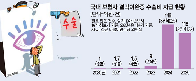 25일 김윤 더불어민주당 의원실이 주요 10개 손해보험사와 16개 생명보험사를 통해 취합한 결막이완증 수술보험금 지급 현황에 따르면 작년 한 해 동안 이들 보험사를 통해 고객들에게 수술비(정액)로 146억원이 지급됐다. 이는 2023년 9억원 대비 16배 늘어난 것이다.