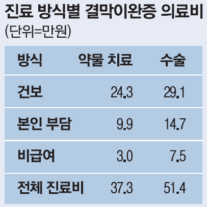 이에 따라 보험사 손해율이 높아지고, 다수 보험 가입자의 보험료가 상승하는 부작용이 예상된다. 이에 더해 건보 재정에도 악영향을 미친다. 약물 치료만 했을 때 국민건강보험공단 부담금은 24만원이지만, 수술을 하면 29만원으로 증가한다.