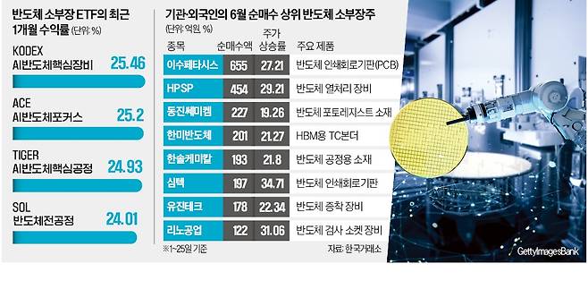 25일 한국거래소에 따르면 ‘KODEX AI반도체핵심장비’ 상장지수펀드(ETF)는 최근 한 달 동안 25.46% 올랐다. 이수페타시스(17.0%), 한미반도체(16.3%), 리노공업(27.2%), 파크시스템스(19.1%) 등 주요 소부장 업체 주가가 이 기간 고공행진한 데 따른 것이다. ‘ACE AI반도체포커스’(25.2%), ‘TIGER AI반도체핵심공정’(24.93%), ‘SOL 반도체전공정’(24.01%) 등 다른 소부장 ETF도 일제히 상승했다.