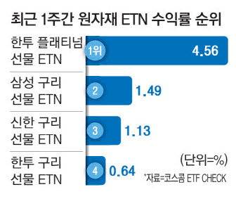 25일 코스콤 ETF CHECK에 따르면 지난 1주 동안 국내 상장 원자재 상장지수증권(ETN) 시장(레버리지·인버스 제외)에서 삼성 구리 선물 ETN(1.49%), 신한 구리 선물 ETN(1.13%), 한투 구리 선물 ETN(0.64%)이 각각 수익률 2, 3, 4위를 차지했다. 1위는 한투 플래티넘 선물 ETN(4.56%)이 차지했지만 상위권에 줄줄이 이름을 올렸다.