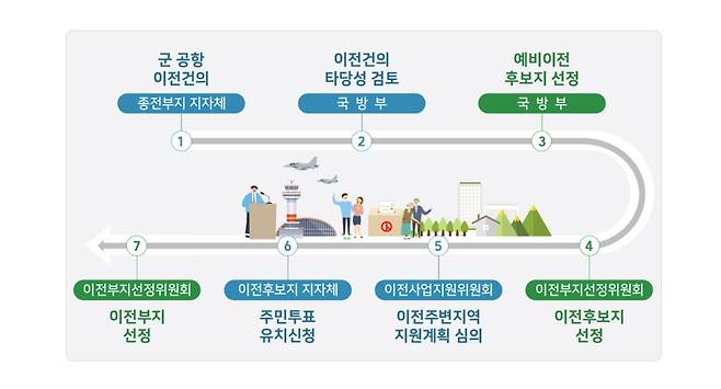 사업절차는 ①군공항 이전 건의(종전 부지 지자체) ②이전 건의 타당성 검토(국방부) ③예비 이전 후보지 선정(국방부) ④이전 부지 선정(이전부지 선정위원회) ⑤이전 주변지역 계획 심의(이전사업지원위원회) ⑥주민 투표 유치 신청(이전후보지 지자체) ⑦이전부지 선정(이전부지 선정위원회) 순이다.
