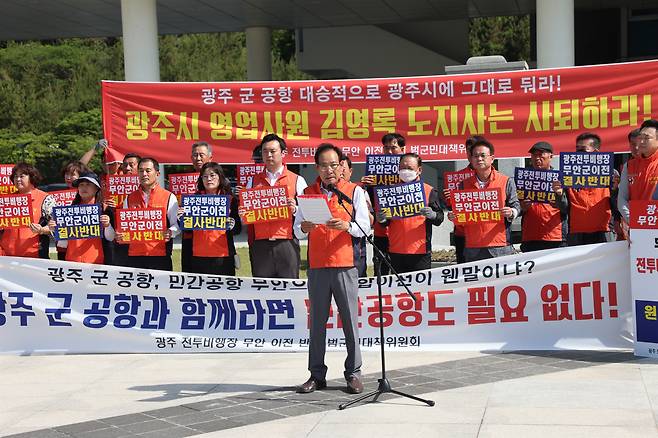 | ▲ 광주 전투비행장 무안이전반대 범군민대책위원회는 2023년 5월 17일 전남도청 앞에서 기자회견을 열고 '광주 군 공항 관련 전남지사 담화문' 과 관련해 김영록 전남지사를 규탄했다. |