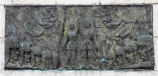 | ▲ 경주 황성공원 김유신 동상 아래엔 화랑과 그를 따르는 낭도를 형상화 한 부조(浮彫)가 있다. |