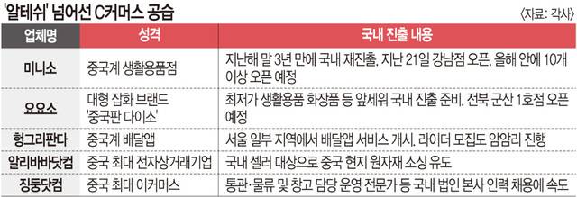 ‘알테쉬’(알리익스프레스·테무·쉬인)로 대표되는 C커머스를 넘어 오프라인에서도 중국발 공습이 시작됐다. 25일 유통업계에 따르면 중국계 유통공룡들은 배달업계부터 생활잡화 브랜드까지 분야를 가리지 않고 국내 전선을 넓히고 있다. 중국발 초저가 공세에 성장이 정체된 국내기업들의 입지가 더 좁아질 것이란 우려도 나온다.