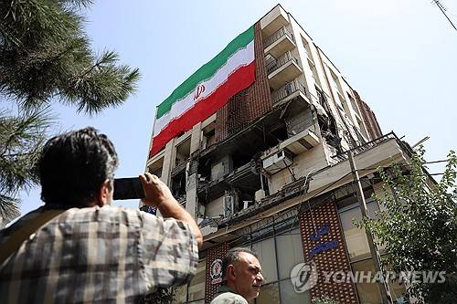 epa12196226 A large-scale national flag hangs from a damaged building that was hit by a recent Israeli airstrike, in Tehran, Iran, 25 June 2025, during a US-mediated ceasefire between Iran and Israel. Israel has been conducting a campaign across Iran since 13 June, targeting nuclear, military, and energy facilities, prompting Iran to launch retaliatory waves of missiles and drones toward Israel. EPA/ABEDIN TAHERKENAREH