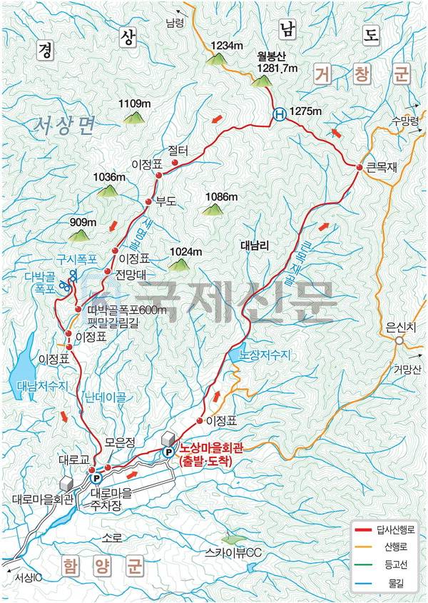 취재팀은 ‘근교산&그 너머 <459> 함양 월봉산’ 편에 영각사에서 남령을 올라 월봉산~큰목재~노상마을로 이어지는 코스를 이미 알렸다. 이번에 다시 찾은 월봉산은 ‘오르GO 함양’ 산악 완등 인증 경로를 따라 노상 마을에서 큰목재로 올라 선 뒤 헬기장을 거쳐 정상을 찍고, 헬기장에서 새명골의 다박골 폭포 비경을 만나는 코스이다. 취재팀 경로를 따른다면 큰목재까지 완만하며 이후 헬기장까지 조금 가파르다. 취재팀이 간 경로의 역방향으로, 대로 마을에서 다박골 폭포를 경유해 월봉산 정상을 밟는다면 큰목재 코스보다 훨씬 길이 험해 힘이 많이 든다.