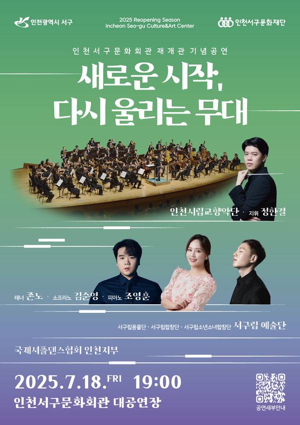 인천서구문화재단은 다음 달 18일 오후 7시 새롭게 단장한 서구문화회관 대공연장에서 재개관 기념공연 '새로운 시작, 다시 울리는 무대'를 개최한다.