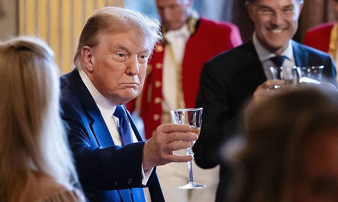 | “건배합시다” 북대서양조약기구(NATO·나토) 정상회의 참석을 위해 네덜란드 헤이그를 찾은 도널드 트럼프 미국 대통령(왼쪽 두번째)이 24일(현지시간) 하우스텐보스궁에서 열린 빌럼 알렉산더르 국왕 주최 환영만찬에서 건배를 위해 잔을 들고 있다. 헤이그=EPA연합뉴스 |