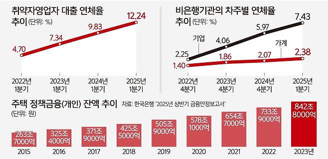 25일 한국은행이 발표한 ‘2025년 상반기 금융안정상황 보고서’에 따르면 올해 1분기 말 기준 취약 자영업자 대출 연체율은 12.24%로, 2013년 2분기 말(13.54%) 이후 최고치를 기록했다. 취약 자영업자는 다중 채무자이면서 저소득이거나 저신용인 차주를, 대출 연체는 1개월 이상 원리금 연체를 각각 가리킨다.