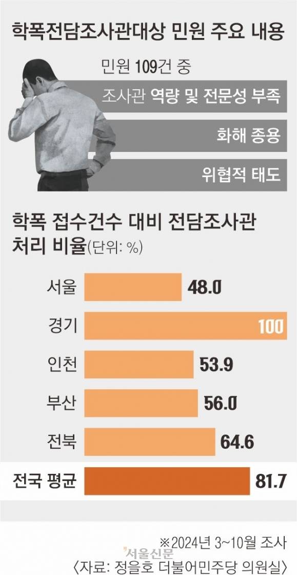25일 정을호 더불어민주당 의원실이 전국 17개 교육청에서 받은 자료에 따르면 학교폭력전담조사관 제도가 시행된 지난해 3~10월 사이 전담조사관 관련 민원 건수는 총 109건이었다. 주요 사유는 ▲조사관 역량 및 전문성 부족 ▲화해 종용 ▲위협적 태도 등이다.