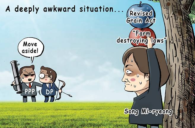 Controversy continues to surround Minister of Agriculture, Food and Rural Affairs Song Mi-ryeong, the only cabinet member from the previous administration to be retained by the new government. Song had previously denounced the revised Grain Management Act and other agriculture-related bills passed under the Yoon Suk Yeol administration as “farm-destroying laws.” On June 25, she apologized for her remarks and pledged to work with the National Assembly to craft a compromise version of the law. Some within the Democratic Party and farmers' groups are demanding that the original bill be passed and that Song be removed from her post, while the opposition People Power Party has escalated criticism, labeling her an “opportunist.” [PARK YONG-SEOK]