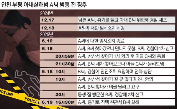 끝내 A씨는 19일 오후 4시30분께 인천 부평구 부평동 자택 현관에서 흉기로 아내를 무참히 살해했다.