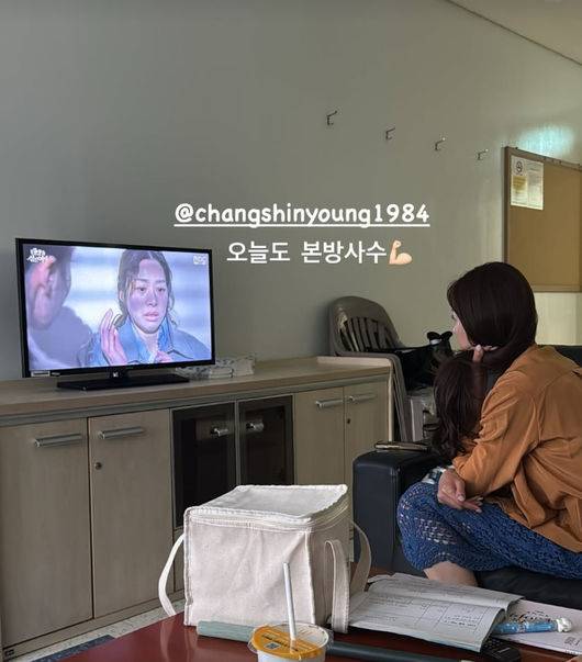 장신영은 "오늘도 본방사수"라고 글을 남겼다. 공개된 사진 속에서 장신영은 자신이 출연하는 드라마를 진지한 모습으로 보면서 모니터링해 눈길을 끌었다.