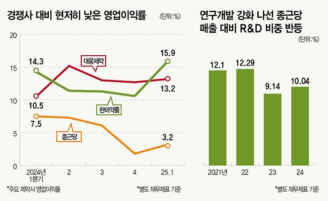 올해 1분기 기준 한미약품 매출은 대부분 제품 매출이고 대웅제약도 상품 매출 비중이 35.1%로 종근당과 비교하면 크게 낮은 편이다. 경쟁 제약사는 종근당과 달리 자체 개발 품목으로 매출 대부분을 확보해 높은 마진을 유지 중인 것이다.