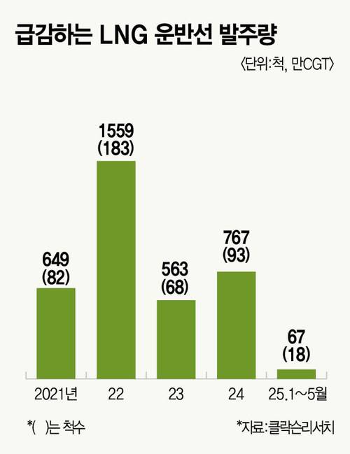 전 세계 경기 침체가 지속되는 가운데 트럼프발 관세 전쟁 여파로 선박 발주량이 감소했기 때문이란 분석이다. 관세 전쟁으로 글로벌 물동량이 감소할 가능성이 높아 글로벌 선사들이 신규 선박에 대규모 투자를 단행할 이유가 사라졌다. 코로나19 기간 발주한 선박들이 최근 쏟아져 나오며 선박 공급 과잉 현상이 두드러진 것도 영향을 미쳤다. 국제해사기구(IMO) 규제에 따라 2050년까지 친환경 선박을 순차적으로 도입해야 하는 선주들이 선박 발주 결정을 미뤘기 때문이란 해석도 나온다.