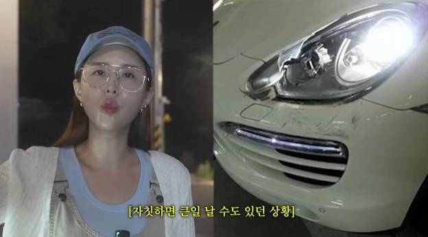 제작진은 "어떤 사연이 있었냐"고 물었고, 신지는 "앞에 차가 밟아서 바닥에 떨어져있던 판 스프링이 내 차 앞으로 날아와서 여기를 이렇게 박은거다"라고 아찔했던 상황을 전해 충격을 안겼다.