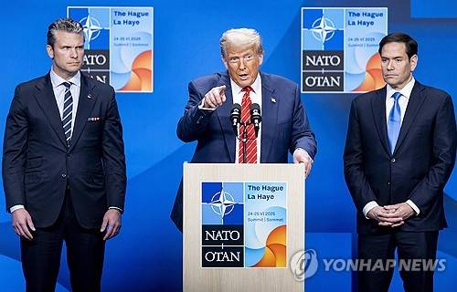 epa12196828 US President Donald Trump (C) attends a press conference with US Defence Secretary Pete Hegseth (L) and US State Secretary Marco Rubio (R) after the NATO Summit in The Hague, Netherlands, 25 June 2025. EPA/Robin van Lonkhuijsen