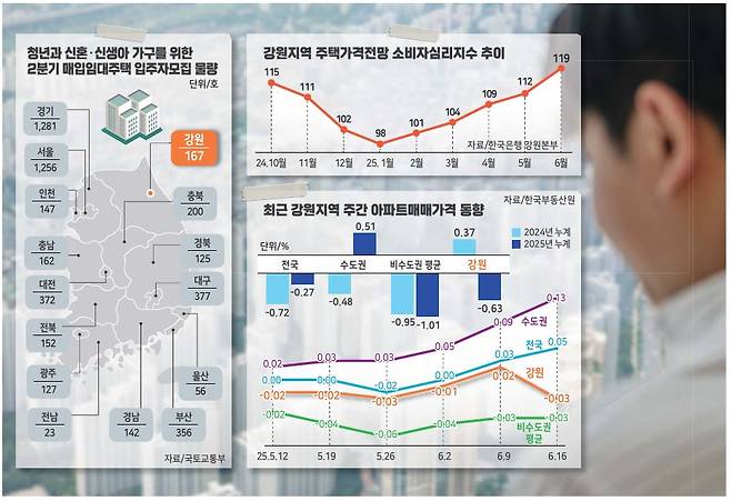 반면 도민들은 하반기 집값 상승을 예상하고 있다. 한국은행 강원본부가 발표한 6월 강원소비자심리지수를 보면 ‘주택가격전망 CSI’가 119로 전월(112)대비 7p 상승했다. 지난 1월 탄핵정국에는 98로 집값 하락을 전망했지만 올 상반기 꾸준히 지수가 상승한 모양새다. 이 지수는 1년 뒤 집값이 지금보다 오를 것이라고 답한 응답자가 내릴 것이라는 응답자보다 많다는 뜻이다. 전국적으로는 120으로 한 달 전보다 9p 상승해 2021년 10월(125) 이후 3년 8개월 만에 가장 높은 수준이고 상승 폭도 2년 3개월 만에 최대치를 기록했다.