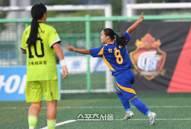 울산 현대청운중 반효린(오른쪽)이 25일 경남 합천에서 열린 ‘2025 스포츠케이션 명품도시 합천에서 펼쳐지는 제33회 여왕기 전국여자축구대회’ 중등부 전북체육중과의 8강전에서 선제골을 넣은 뒤 기뻐하고 있다. 2025. 6. 25.