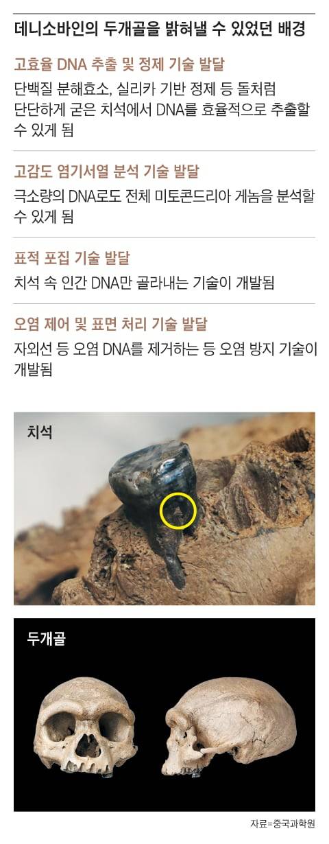 이번에 연구팀은 두개골에 남아 있던 어금니에서 0.3㎎의 치석을 채취해 DNA 분석을 시도, 성공했다. 이 DNA가 기존 데니소바인의 뼈에서 나온 DNA와 유전적으로 일치하는 것으로 확인됐다. 연구팀은 “이번 연구는 인류 화석의 치석이 고대 DNA 보존의 새로운 창구가 될 수 있음을 보여준다”며 “이는 고대 인류의 유전 연구에 새로운 장을 연 것”이라고 했다.
