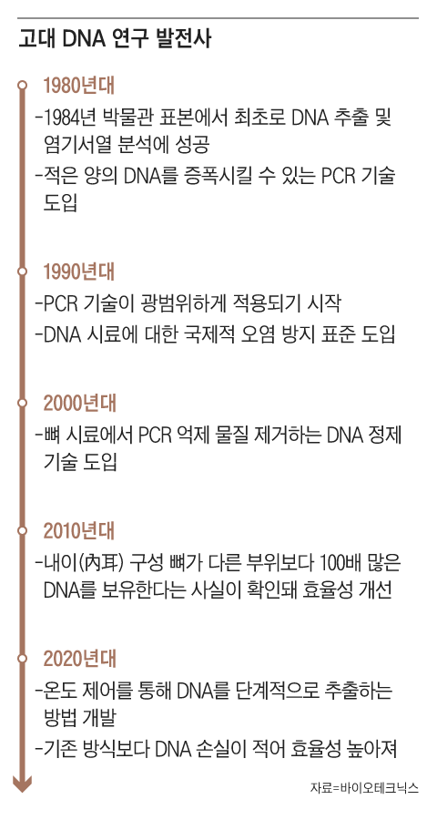 데니소바인의 얼굴을 찾아준 데는 40여 년에 걸쳐 발전해온 유전자 분석 기술이 기여했다. 고대 유전자에 대한 분석은 1984년 미국 캘리포니아대 연구팀이 멸종 동물 콰가얼룩말 표본에서 DNA를 추출하는 데 성공하면서 본격적으로 발달했다. 특히 유전자를 증폭시키는 기술로 PCR(중합효소 연쇄반응)이 등장하면서 관련 연구가 더욱 활기를 띠었다. 유전자의 특정 부위를 반복적으로 복제해 증폭함으로써, 소량의 DNA로도 정확한 분석이 가능해졌기 때문이다.