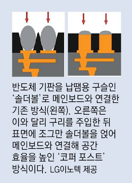 LG이노텍은 기존 솔더볼이 들어갔던 틈에 구리를 대신 주입했다. 기판 틈을 직각 기둥 형태의 구리가 채우자 공간 효율이 올랐다. 이러한 코퍼 포스트 기술을 통해 솔더볼 간의 간격을 좁혀 같은 성능 기준 최대 20% 작은 반도체 기판을 만들 수 있게 됐다. LG이노텍은 “스마트폰 제조사들이 설계 자유도를 높이고 얇은 디자인을 구현할 수 있는 것”이라고 말했다.