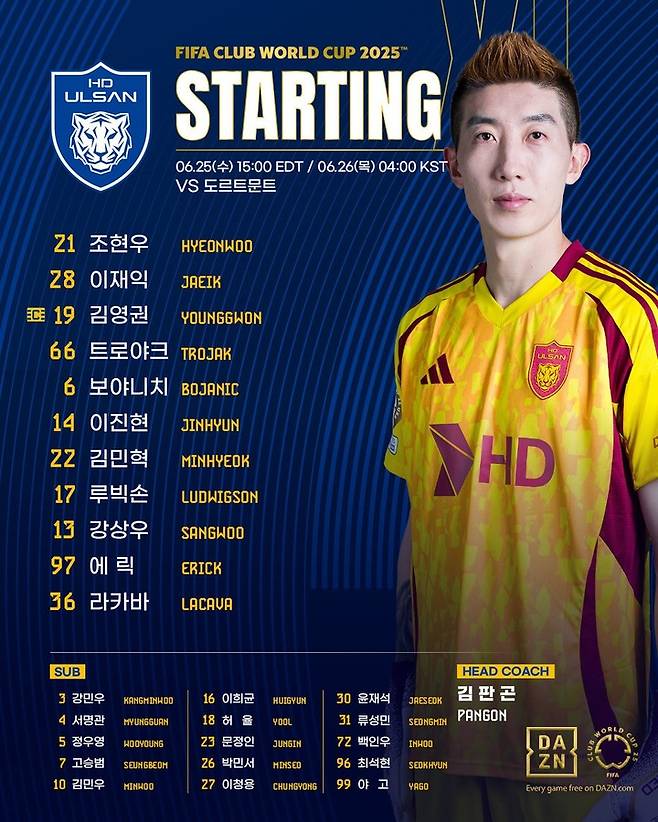 김판곤 감독이 이끄는 울산은 26일 오전 4시(한국시간) 미국 신시내티의 TQL 스타디움에서 2025 국제축구연맹(FIFA) 클럽 월드컵 조별리그 F조 3차전에서 도르트문트와 맞붙는다.