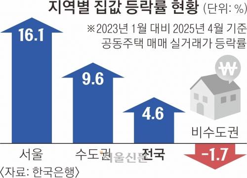 한국은행이 25일 발표한 '2025년 상반기 금융안정보고서'에 따르면 2023년 1월 대비 올해 4월 서울 집값은 16.1% 오른 반면 비수도권은 오히려 1.7% 하락한 것으로 나타났다.
