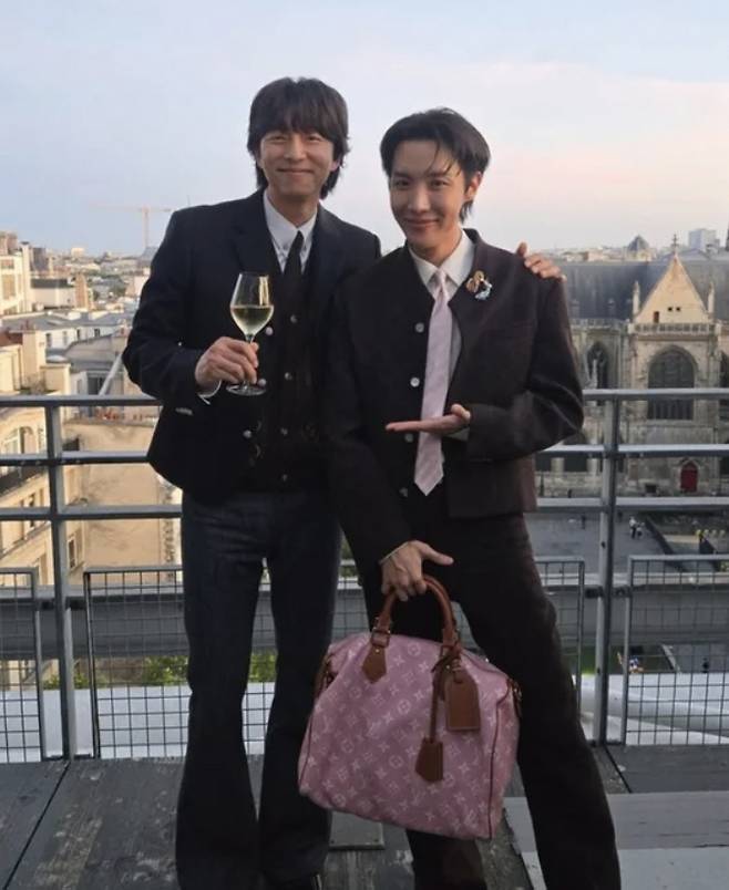 제이홉은 25일 자신의 계정에 별다른 멘트 없이 사진을 여러 장 게재했다. 공개된 사진에서 제이홉과 공유는 파리를 배경으로 포즈를 취하고 있다. 제이홉은 핑크색 L사 명품백을 들고 있지만, 명품백 보다 더 눈에 띄는 건 두 사람의 패션이다. 제이홉은 가방과 깔맞춤한 핑크색 넥타이와 브로치로 포인트를 줬다. 공유는 나팔바지에 이마를 덮은 장발 스타일로 80년대 무드를 연출했다.