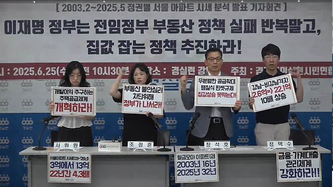 경실련은 어제(25일) 서울 종로구 경실련 강당에서 기자회견을 열고, 2003년 2월부터 지난달까지 서울 아파트 시세를 정권별로 나눠 분석한 결과를 발표했습니다.