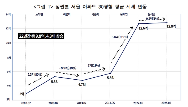 정권별 시세 변동을 보면, 노무현 정부(3억 원→5억 3천만 원·80%↑), 박근혜 정부(4억 7천만 원→5억 8천만 원·21%↑)가 뒤를 이었습니다.