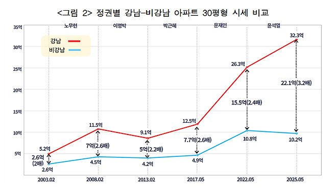 액수로 보면, 노무현 정부 초기 강남(5억 2천만 원)과 비강남(2억 6천만 원)의 격차는 2억 6천만 원이었는데, 윤석열 정부 말기에는 22억 1천만 원을 기록해 8.5배가량으로 늘었습니다.