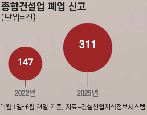 올해 들어 폐업 신고를 한 종합건설 업체 수는 6월 24일 기준으로 작년 전체 수치 275곳을 이미 넘어서 311곳이다.