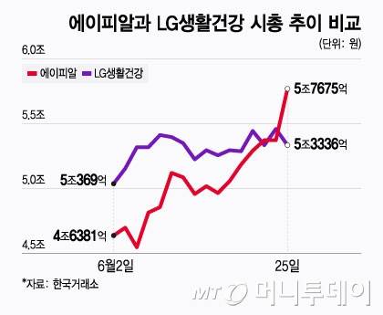 26일 한국거래소에 따르면 에이피알은 전날 코스피에서 1만400원(7.4%) 오른 15만1600원에 거래를 마감했다. 이날 종가 기준 시가총액은 5조7674억원으로 집계되며 LG생활건강(5조3336억원)을 제쳤다. 아모레퍼시픽(8조 1188억원)에 이어 업계 2위다. 지난 23일 에이피알은 처음으로 LG생활건강을 앞섰지만 전날 역전을 허용한 후 이날 다시 LG생활건강을 추월했다.
