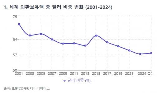 26일 로이터 통신 등에 따르면 국제통화기금(IMF) 통계를 인용해 세계 중앙은행의 외환보유액 중 미 달러화 비중은 최근 하락세를 보였다. 2001년 약 71%였던 달러 비중은 지난해 3분기에는 57.4%로 떨어졌다. IMF의 '각국의 외환보유액 통화별 구성보고서(COFER)' 최신 데이터(2024년 4분기 기준)에서도 달러 자산이 세계 공식 외환보유액에서 57.8%를 차지하는 데 그쳤다. 10년 전보다 약 9% 포인트 감소했다.