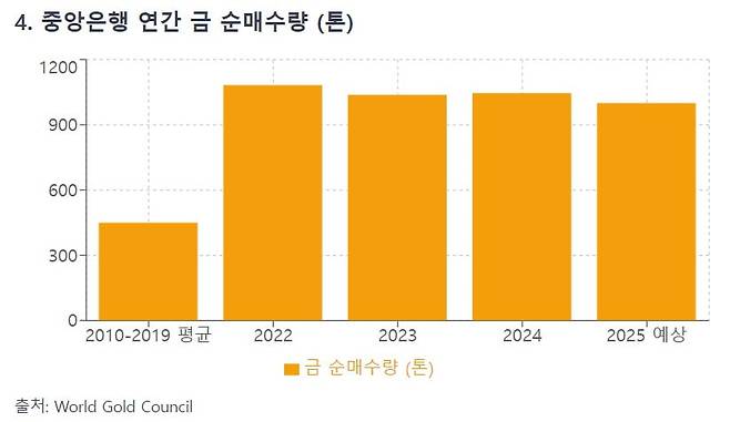 세계금위원회(WGC) 자료에 따르면 세계 중앙은행은 2022년~2025년 4년 연속으로 연 1000톤 이상의 금 매입할 전망이다. 2010년대 연평균 매입량의 두 배 이상에 달하는 속도다. 구체적으로 보면 신흥국과 최근 지정학적 리스크 관련 국가가 금을 선호한다. 러시아와 중국이 대표적이다. 중국 인민은행은 2015년 외환보유액 대비 금 비중이 1.8%에 불과했다. 최근엔 4.9%까지 끌어올렸다.