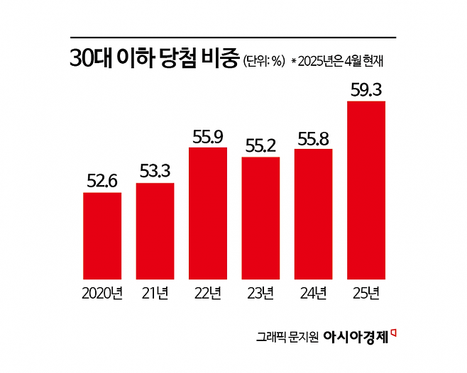 30대 이하 당첨자 비율은 2020년 52.6%에서 지난해에는 55.8%으로 점차 높아지는 추세다. 올해 들어 상승 폭이 더 커지면서, 통계 집계가 시작된 2020년 이후 연간 기준으로 역대 최고치를 경신할 가능성이 크다.