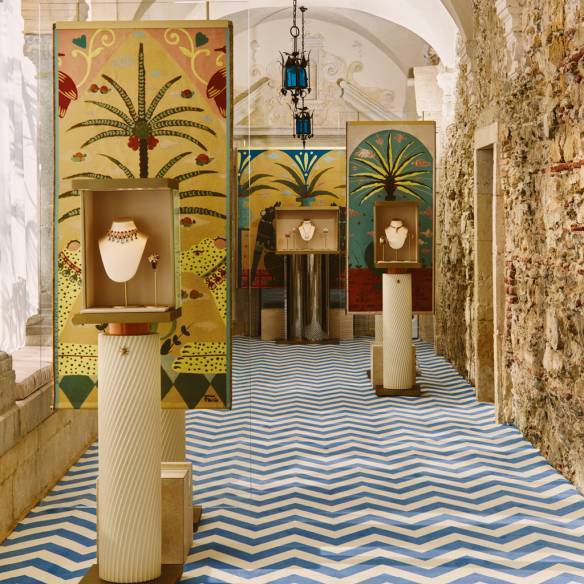 이 대담한 컬렉션은 무대 위에서도 그 존재감을 아낌없이 드러냈다. 시칠리아 타오르미나의 고대 그리스 원형극장에서 열린 이벤트는 불가리의 상상력을 극적으로 구현한 퍼포먼스로 구성됐다. 세계적 현대무용가이자 연출가인 웨인 맥그리거 경이 연출한 3막의 현대무용 공연은 모델들의 움직임을 통해 색과 빛, 감정을 하나의 스펙터클로 엮었다. 이 현장을 보기 위해 블랙핑크 리사가 참석했고, 현장에선 감탄이 끊이지 않았다. 쇼가 끝난 후 산 도메니코 팰리스에서 공개된 ‘폴리크로마 쇼룸’은 말 그대로 꿈의 공간이었다. 불가리 하우스 최대 규모의 컬렉션을 선보이기 위해 15세기에 지어진 수도원을 개조한 호텔, 산 도메니코 팰리스가 현대적 갤러리로 탈바꿈했고, 이탈리아 조각가 리카르도 가티의 금박 조각과 시칠리아 장인의 도자기 오브제가 컬렉션의 이야기를 완성했다.