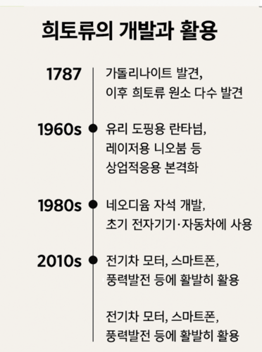 이처럼 희토류는 단순한 원소에서 시작해, 오늘날 국가 안보와 산업 경쟁력의 핵심 자원으로 자리 잡게 되었답니다.